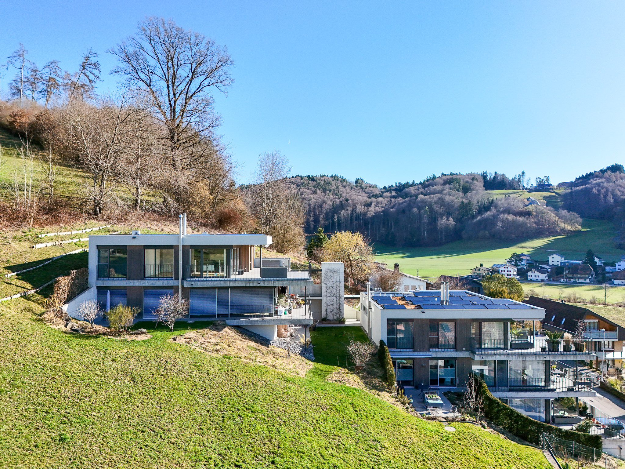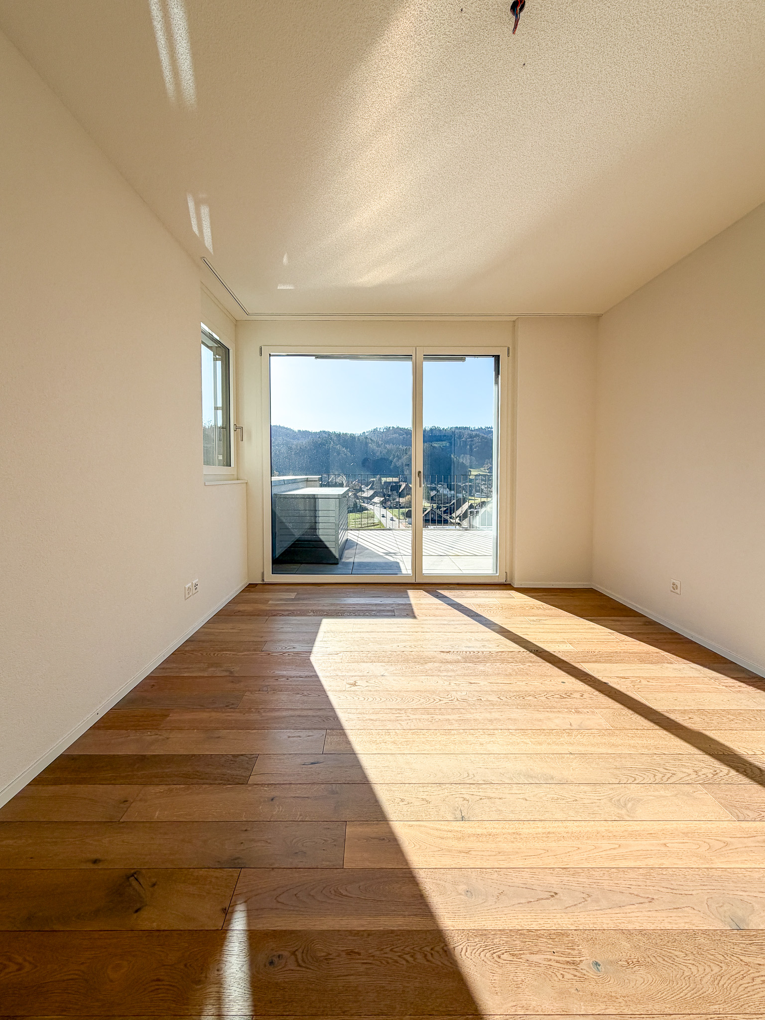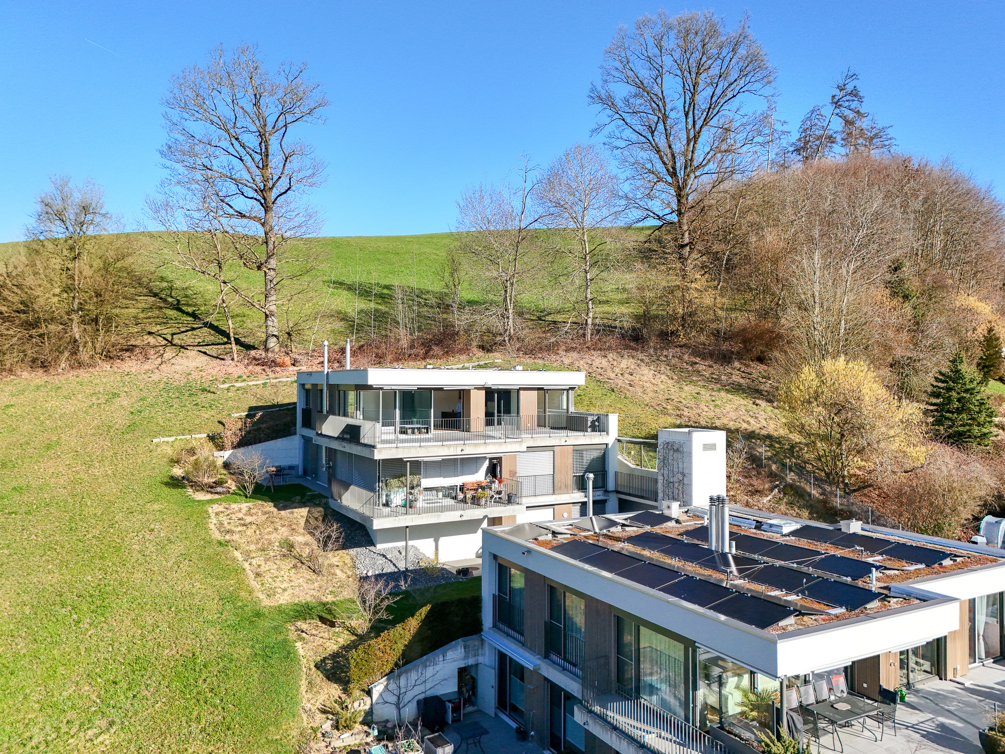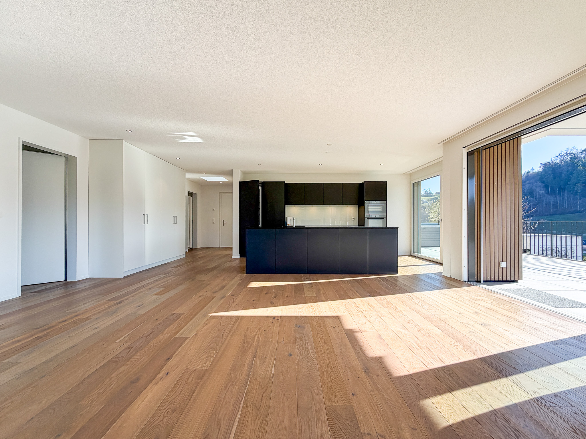 Die moderne und grosszügige Attikawohnung liegt an erhöhter Lage in Krauchthal mit wunderbarer Sicht ins Grüne. Die Wohnung ist Teil von zwei baugleichen 3-Parteienhäusern mit Baujahr 2020. Die Attikawohnung verfügt über einen modernen Grundriss mit grosszügigem offenem Wohn-/Essbereich mit Schwedenofen sowie offener integrierter Küche (total 63 m²) mit direktem Zugang zur Terrasse (72 m²). Die Terrasse ist über den gesamten Essbereich / Küche via bodenebene Fensterfronten zugänglich und bietet eine schöne Sicht ins Grüne / Richtung Südwest und verfügt zudem über einen grossen gedeckten Bereich. Ebenfalls im südwestlichen Teil der Wohnung liegt ein Zimmer mit 16 m² Fläche, ein weiteres Zimmer (14 m²) mit begehbarem Kleiderschrank (4 m²) liegt auf der Nordostseite. Direkt mit diesem Zimmer verbunden ist das Badezimmer mit Badewanne (6 m²). Beim Eingangsbereich befindet sich ein weiteres Badezimmer (5 m²) mit Dusche sowie ein praktisches Reduit (5 m²). Durch die geschickte Raumaufteilung sowie den hochwertigen und stilvollen Innenausbau ist die Wohnung sehr hell und freundlich und verfügt über eine luftige und gleichzeitig heimelige Wohnatmosphäre. Die Wohnung wird heute als 3.5 Zimmerwohnung genutzt, könnte aber mit einfachen Massnahmen zu einer 4.5-Zimmerwohnung umgenutzt werden. Zur Wohnung gehört eine eigene Waschküche (12 m²), ein grosser Kellerraum (12 m²) sowie ein Einstellhallenplatz (Nr. 4). Die Einstellhalle ist mit einer Basisinstallation für die Elektromobilität ausgerüstet (der Einstellhallenplatz kann bei Bedarf angeschlossen werden). Das Untergeschoss sowie die Einstellhalle sind bequem via Lift erreichbar; der gesamte Bereich inkl. der Wohnung ist stufenlos.