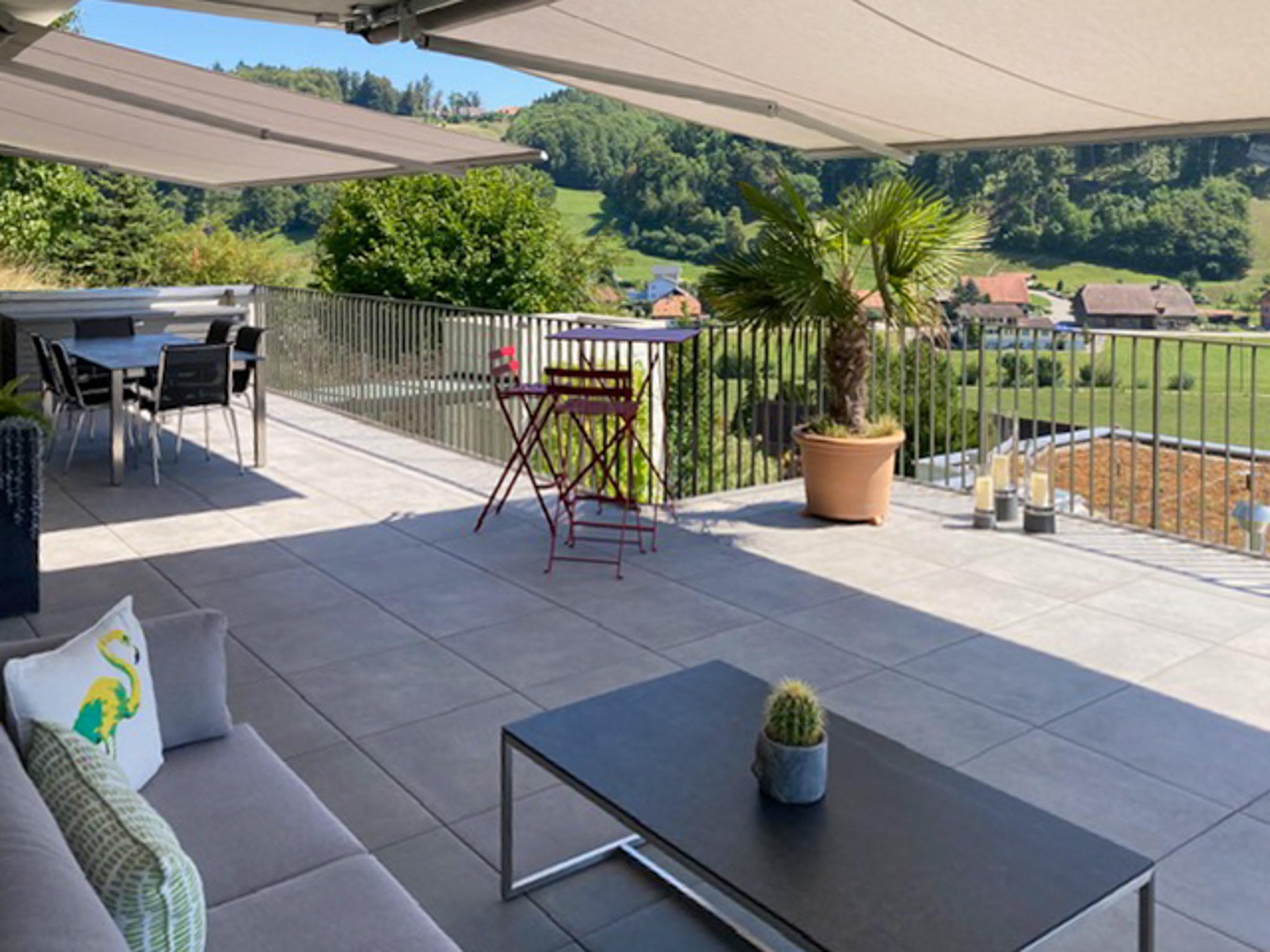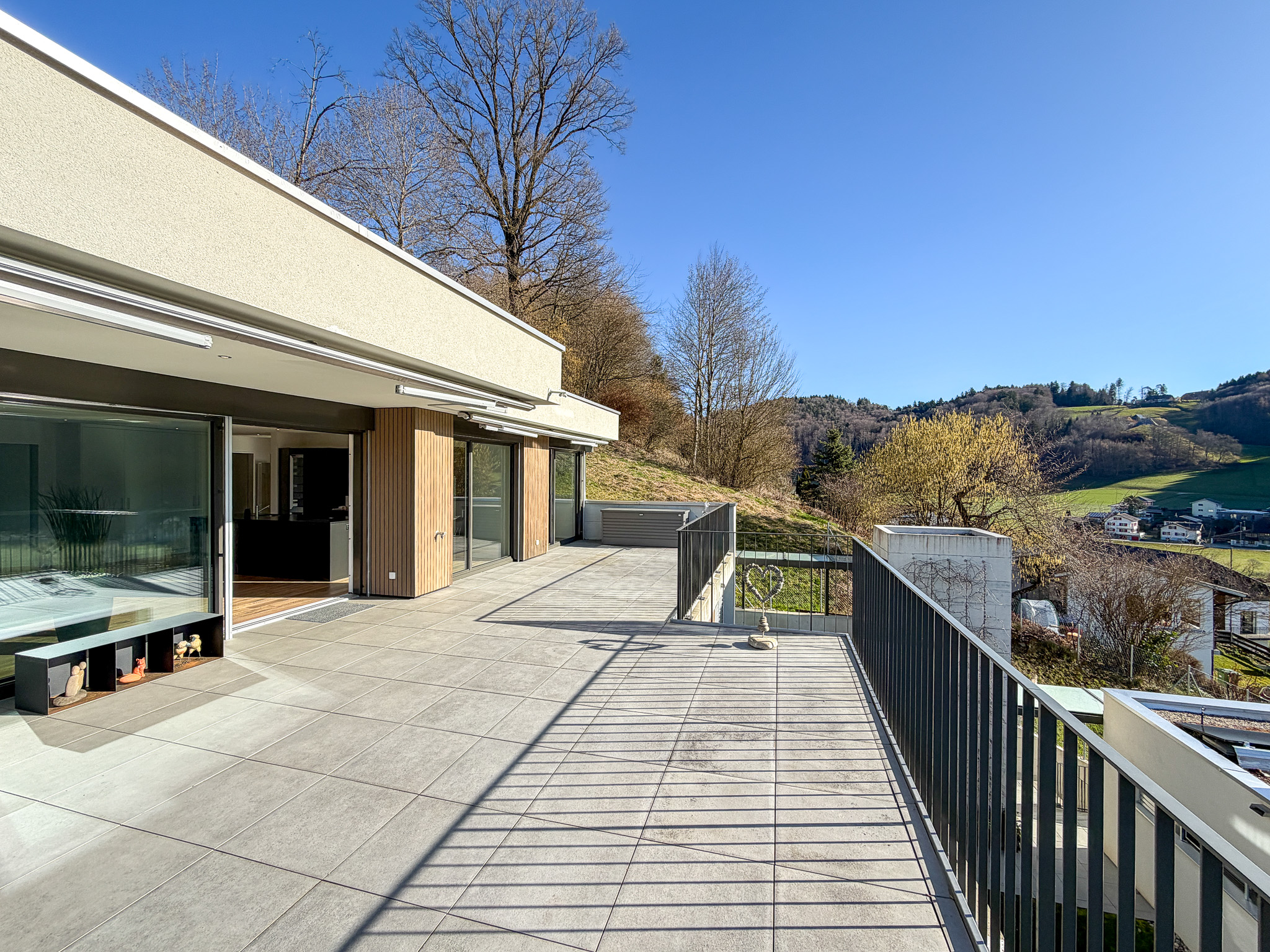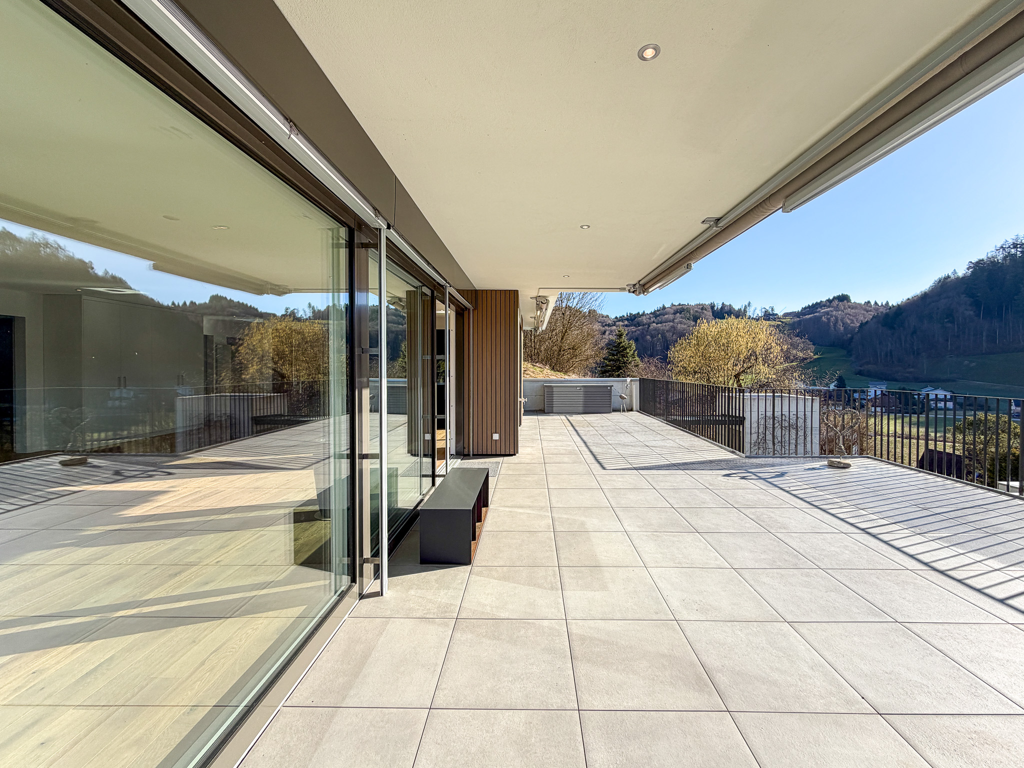 Die moderne und grosszügige Attikawohnung liegt an erhöhter Lage in Krauchthal mit wunderbarer Sicht ins Grüne. Die Wohnung ist Teil von zwei baugleichen 3-Parteienhäusern mit Baujahr 2020. Die Attikawohnung verfügt über einen modernen Grundriss mit grosszügigem offenem Wohn-/Essbereich mit Schwedenofen sowie offener integrierter Küche (total 63 m²) mit direktem Zugang zur Terrasse (72 m²). Die Terrasse ist über den gesamten Essbereich / Küche via bodenebene Fensterfronten zugänglich und bietet eine schöne Sicht ins Grüne / Richtung Südwest und verfügt zudem über einen grossen gedeckten Bereich. Ebenfalls im südwestlichen Teil der Wohnung liegt ein Zimmer mit 16 m² Fläche, ein weiteres Zimmer (14 m²) mit begehbarem Kleiderschrank (4 m²) liegt auf der Nordostseite. Direkt mit diesem Zimmer verbunden ist das Badezimmer mit Badewanne (6 m²). Beim Eingangsbereich befindet sich ein weiteres Badezimmer (5 m²) mit Dusche sowie ein praktisches Reduit (5 m²). Durch die geschickte Raumaufteilung sowie den hochwertigen und stilvollen Innenausbau ist die Wohnung sehr hell und freundlich und verfügt über eine luftige und gleichzeitig heimelige Wohnatmosphäre. Die Wohnung wird heute als 3.5 Zimmerwohnung genutzt, könnte aber mit einfachen Massnahmen zu einer 4.5-Zimmerwohnung umgenutzt werden. Zur Wohnung gehört eine eigene Waschküche (12 m²), ein grosser Kellerraum (12 m²) sowie ein Einstellhallenplatz (Nr. 4). Die Einstellhalle ist mit einer Basisinstallation für die Elektromobilität ausgerüstet (der Einstellhallenplatz kann bei Bedarf angeschlossen werden). Das Untergeschoss sowie die Einstellhalle sind bequem via Lift erreichbar; der gesamte Bereich inkl. der Wohnung ist stufenlos.