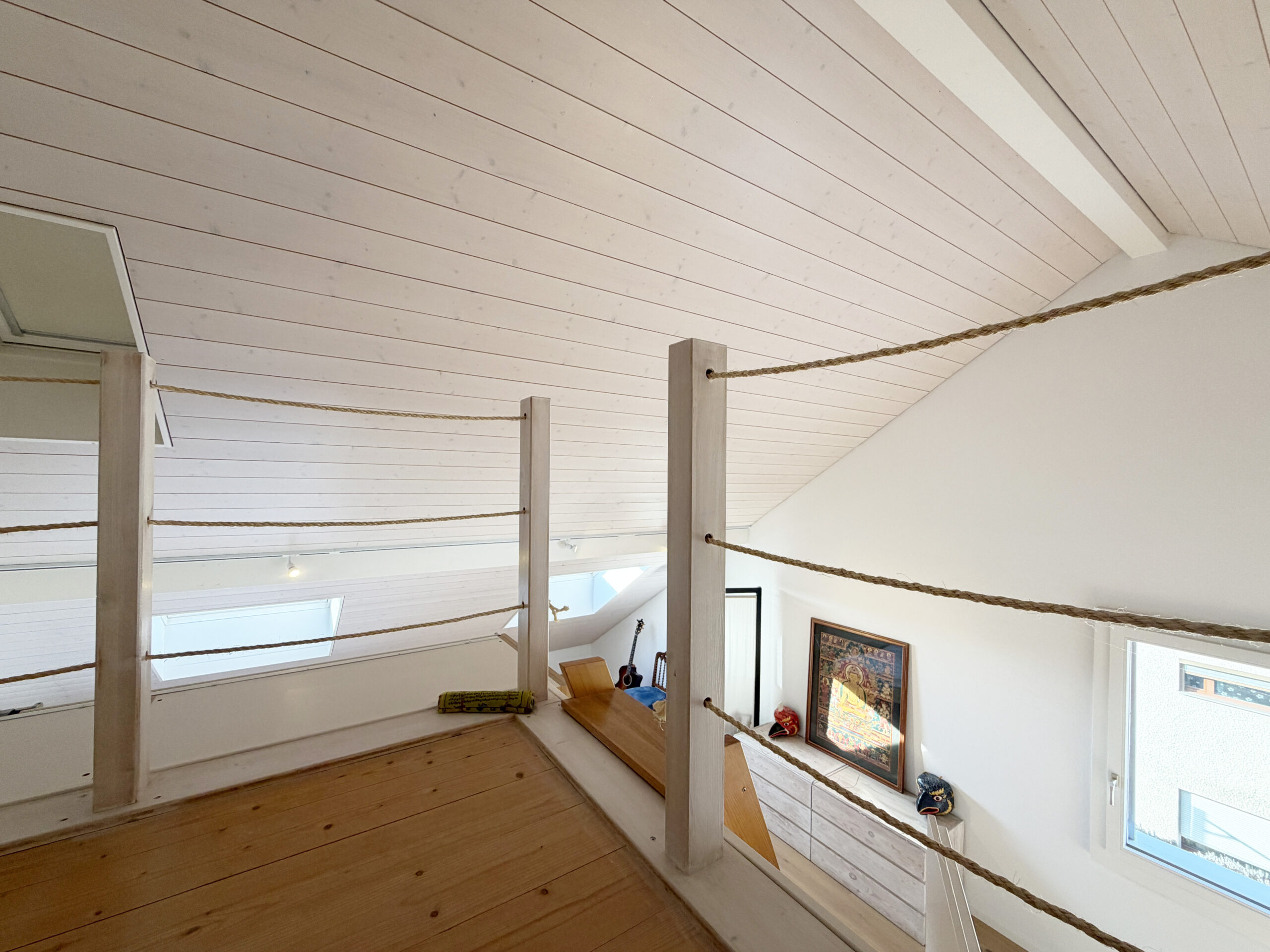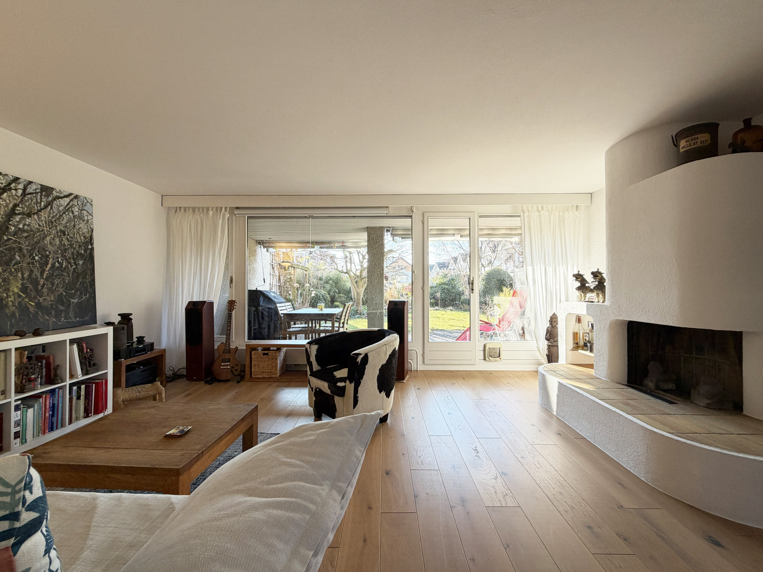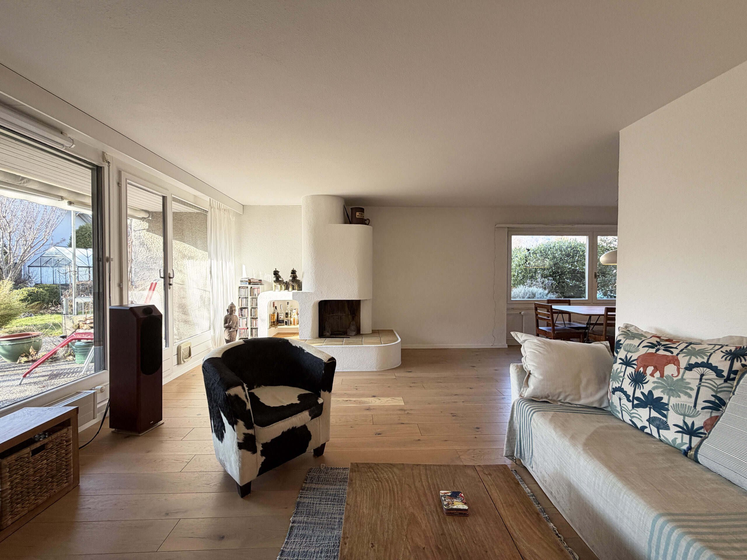 Das charmante Eigenheim mit Baujahr 1972 liegt in einem ruhigen Wohnquartier in Münsingen in Gehdistanz zur Aare. Das Gebäude verfügt über zwei Vollgeschosse und ein Dachgeschoss. Der grosszügige Eingangsbereich (12 m²) mit Garderobe und sep. WC befindet sich auf Seite Aareweg, der Rest des Sockelgeschosses auf der Gebäudesüdseite liegt unter Terrain und beherbergt die Waschküche, den Haustechnikraum mit dem Boiler, einen grossen Kellerraum mit direktem Gartenausgang via Treppenanlage sowie einen Schutzraum mit zusätzlichem Stauraum. Das Erdgeschoss ist vom Eingangsbereich via eine schöne offene Treppe abgegrenzt. Hier befindet sich ein grosser offener Wohn-/Essraum (32 m²) mit Cheminée und grossflächigen Fensterscheiben Richtung Garten sowie die ebenfalls offene und moderne Küche (8 m²). Im Obergeschoss befinden sich vier Zimmer (9 m², 9 m², 11 m² und 14 m²), zwei davon mit Zugang zum grosszügigen Südbalkon (10 m²) sowie das Badezimmer mit Dusche (5 m²). Das Dachgeschoss beherbergt nochmals ein Badezimmer (4 m²) mit angrenzendem Dachzimmer (15 m²) sowie einem grossen offenen Raum (40 m² ) mit geschickt eingebautem Galeriebereich über dem Treppenaufgang. Die Wohnfläche beläuft sich auf total 170 m². Geheizt wird seit 2025 mit einer Luft-Wärmepumpe. Zur Liegenschaft gehört zudem eine Garage inkl. Garagenvorplatz. Das Grundstück ist 315 m² gross. Auf der nördlichen Gebäudeseite liegt die Garage inkl. Garagenvorplatz sowie der Gebäudezugang. Auf der südlichen Gebäudeseite befindet sich der grosse idyllische Garten à 180 m² Fläche mit schönen Sträuchern und Bäumen sowie einer grosszügigen Grünfläche. Das Garagendach liegt ebenerdig zur Gartenfläche, ist begrünt und kann als Gartenfläche genutzt werden. Vor dem Wohnzimmer befindet sich ein geschützter/gedeckter Sitzplatz. Durch die leicht versetzte Bauweise des Nachbarhauses bietet der Sitzplatz wie auch der Garten viel Privatsphäre.